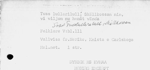 //// ['iv ' «* « ~ v * * //// - - * " ~ ~ - - -r- —. . ; — r r — - * - •• , n - _ - — //// m ,: ¦ ' . *v r : //// ' / • * V . . .as- //// Tuss lullerilull.' Skällkossan min, vi viljom nu hemåt vända //// Folklore V:bl.111 //// Vallvisa fr.Nerike, Knista o Carlskoga Mel.not. 1 str. //// ^ . DYBECK MS KVHAA //// MOBERG EXCERPT ////