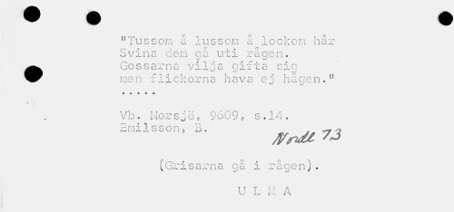 //// "Tussom å lussom a lockom hår Svina dem gå uti rågen. //// •Gossarna vilja gifta sic men flickorna hava ej hågen." //// Vb. Norsj ö? 9609? s.14. Emilsson? B. . ^ ^ //// (Grisarna gå i rågen). //// U L M A ////