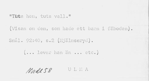 //// " Tiit a he ra, tuta vall." //// (Visan om dem, som hade ett barn i fäboden). Smal. 92:40, s.2 (Hjälmseryd). //// (... lever han än ... etc.) //// /Ta/i u L k A ////