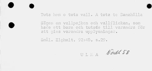 //// Tuta hem o tuta vall. A tuta te Banahälla //// Sägen om vallpojken och vallflickan, som hade ett barn och tutade till varandra för att giva varandra upplysningar. //// Smal. Elghult, 92:45, s.29. //// ULLA ^^ ////