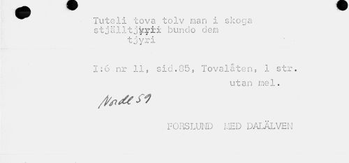 //// Tuteli tova tolv man i skoga stjälltjyyii bundo dem //// tjyri - ¦ //// 1:6 nr 11, sid.85, Tovalåten, 1 str. //// utan mel. //// FORSLUND MED DALÄLVEN ////