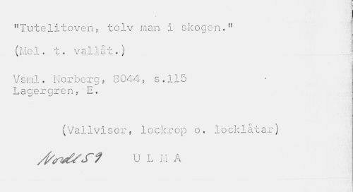 //// / //// "Tutelitoven, tolv man i skogen." //// (Me1. t. vallat.j //// Vsml. Norberg, 8044, s.115 Lagergren,'E. //// (Vallvisor, lockrop o. locklåtar) //// U L M A ////