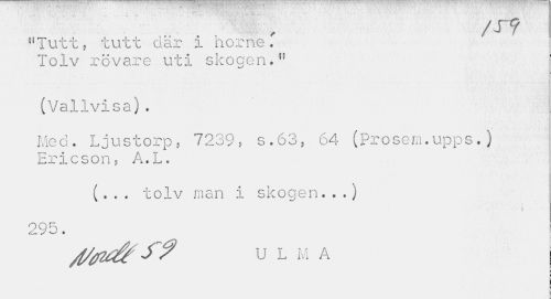 //// ... . • i. - ' ¦ //// /t? //// tfTutt, tutt dar i horne. Tolv rövare uti skogen.f 1 //// (Vallvisa). //// Med. Ljustorp, 7239, s.63, 64 (Prosem.upps.) Ericson, A.L. //// ( . . . tolv man i skogen...) //// 295. //// /t/fZ&jy u L M A ////