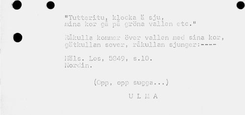 //// "Tutteritu, klocka ä sju, //// mina kor gå på gröna vallen etc." //// £ Råkulla kommer över vallen med sina kor, //// gätkullan sover, råkullan sjunger:--- //// Hals. Los, 5849, s.10. Nordin. //// (Opp, opp sugga..«) //// U L M A ////