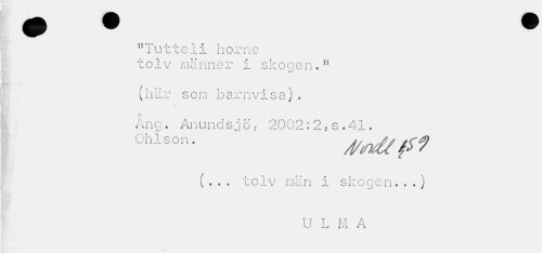 //// "Tutteii horne //// tolv niänner i skogen." //// (här som barnvisa). //// i //// o //// Ang. Anundsj ö, 2002:2,s.41. //// ohlson- /f/cndtfi? //// ( . . . tolv nän i skogen...) //// U L M A ////