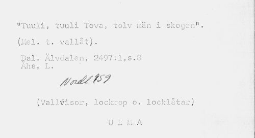 //// "Tuuli, tuuli Tova, tolv män i skogen". (L ie 1. "c* v a 11 a *c) . pa1. Ä1v c a1e n, 2497;1,s.G //// I T //// /"ii i S 5 c //// yVtruéSff? //// (Vallvisor, lockrop o. locklåtar) //// U L iv; A ////