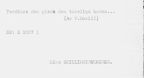 //// Tvedörra den alada den trevliga heden... //// (Av V.Ducill) //// SE: E 1387 1 //// : //// KB:s SKILLINGTRSCKSREG. ////