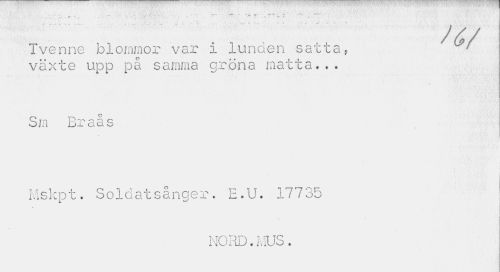 //// r »" — - " 7 - - . //// f • ... ~ //// j //// Tvenne blommor var i lunden satta, växte upp på samma gröna matta... //// Sm Braås //// Mskpt. Soldatsånger. E.U. 17735 //// i '" //// NORD.MUS. ////