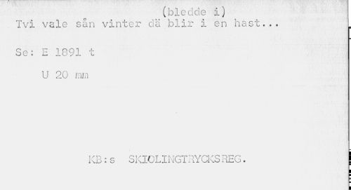 //// ibledoe x J //// Tvi vale sån vinter dä blir i en hast... //// Se; E 1891 t U 20 mm //// KB:s SKIOLINGTRYCKSREG. //// I ////