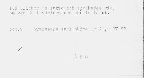 //// Två flickor de sutto ock språkades vid, | //// om vad de I världen sen skulle få si. //// 5:4.? Svenssons saml.häfte Nr 20,s.57-58 / //// A BO ////
