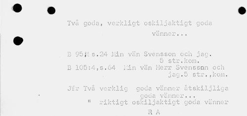 //// ¦ B| A //// Två goda5 verkligt oskiljaktigt goda ^^ vänner... //// B 95j.is.24 Min vän Svensson och jag. //// 5 str.kom. //// B 105:4, s.64 I.lin vän Herr Svensson och //// jag.5 str.,kom. //// Jfr Två verklig goda vänner åtskilj liga //// goda vänner.. * //// w' //// " riktigt oskiljaktigt goda vänner //// P A 11 r\ ////