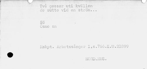 //// Två gossar uti kvällen //// de sutto vid en ström... • * //// OO //// « * //// Gsmo sn //// Mskpt. Arbetssånger I, s.766.E.U. 21899 //// NORD.MUS. ////