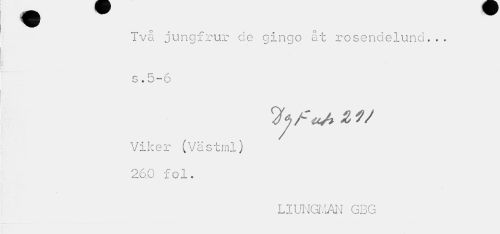 //// Två jungfrur de gingo åt rosendelund... //// s 5-6 //// O • //// Viker (Västml) 26.0 fol. //// LIUNGMAN GBG ////