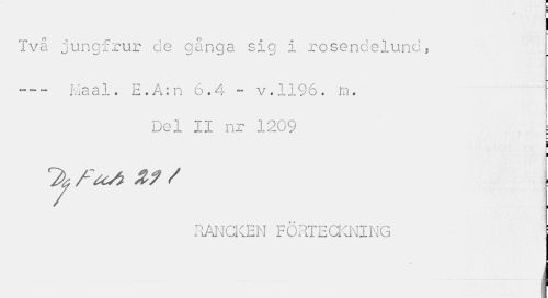 //// I //// I //// Två jungfrur de gånga sig i rosendelund, //// --- Maal. E.A:n 6.4 - v.1196. m. //// Del II nr 1209 : //// i //// ^ fuA Zf / //// RANCKEN FÖRTECKNING //// I ////
