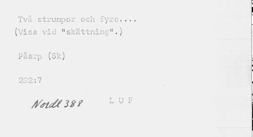 //// I //// Två strumpor och fyra... (Visa vid; "skattning".) //// Påarp (Sk) //// i //// i //// 232:7 //// Mtdt 32? L u 1 ////