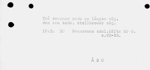 //// Två svenner redo en långan väg, ^^ den ena sade, stallbroder säg, //// 10:2. BO Svenssons saml.häfte Nr 6. //// s.92-93. //// A B O ////