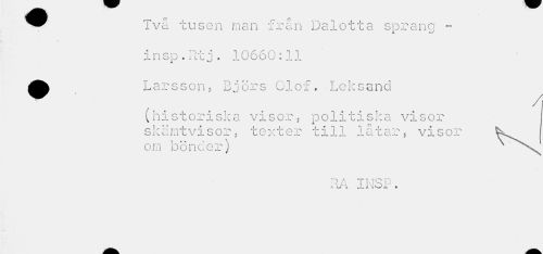 //// ^^ Två tusen man från Dalotta sprang - //// i //// insp.Rt j. 10660:11 //// ^^ Larsson? Björs Olof. Leksand //// (historiska visor, politiska visor skämtvisor., texter till låtar, visor ^^ om bönder) ^^ //// T) T T v T Q D ii/i J-i\Ox' c ////