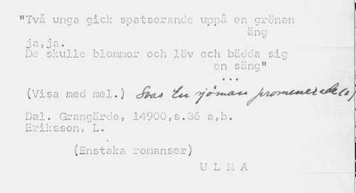 //// "Två unga gick spatserande uppå en grenan //// ä n g //// HO *« O //// JgjJd. //// Do skulle blommor och löv och bädda sic //// w' //// en säng" t • • //// (Visa med mel.) y ******* //// Dal. Grangärde, 14900,s.36 a,b. Eriksson. L. //// (Enstaka romanser) //// U L M A ////