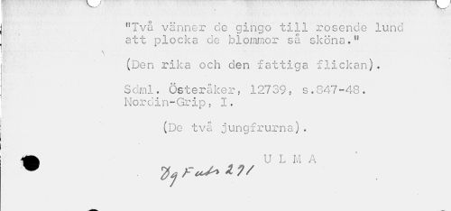 //// 4 //// !?Två vänner de gingo till rosende lund att plocka de blommor så sköna.ft //// \ //// (Den rika och den fattiga flickan). //// Sdml. Österåker, 12739, s.847-48." Nordin-Grip, I. //// (De två jungfrurna). //// ® fa FéO« * 1' ////