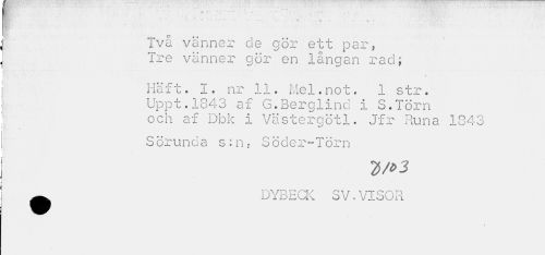 //// ~ * r; " — ... " //// ••••••• - ; . //// Två vänner cle gör ett par, Tre vänner gör en långan rad; //// Häft. 1. nr 11. Mel.not. 1 str. Uppt.1843 af G.Berglind i S.Törn och af Dbk i Västergötl. Jfr Runa 1843 //// Sörunda sin, Söder-Törn //// 2W>3 //// ^ DYBECK SV.VISOR ////