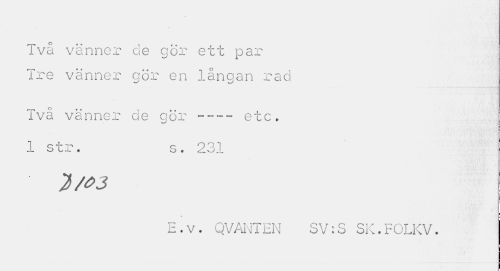//// Två vänner de gör ett par Tre vänner gör en långan rad //// . » ... . . //// Två vänner de qör --- etc. //// 1 str. s. 231 //// 7>/t>3 //// E.v. QVANTEN SV:S SK.FOLKV. ////