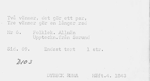 //// Två vänner, det gör ett par, Tre vänner gör en lånqer.rao //// w' //// Nr 6. F o1k1e k . Ål1män //// Uppteckn.från Sorund //// Sid. 69. Endast text 1 str. //// 2/o 3 //// v //// DYBECK RUNA Häft.4. 1843 ////