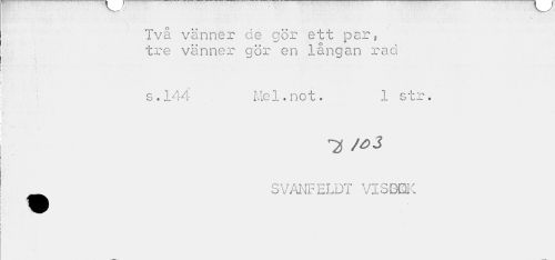 //// Två vänner de gör ett par, //// o //// tre vänner gör en langan rad //// ¦ //// ¦ - ¦ //// I' //// i I ¦ I I II IIIIH //// s.144 Mel.not. 1 str. //// H JOZ //// SVANFELDT VISBOK ////