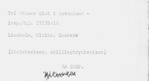 //// » » //// Två vänner gick i rosenlund - //// w //// insp.Rt j. 17125:13 //// \ //// Lindholm, Ulrika, Enskede j //// ¦ J //// (kär1e k svis or, s ki11i ngtryc ksvis or) //// RA INSP. ////