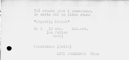 //// V - //// Två vänner gick i rosenlund, de sutto där en liten stund //// "Olycklig kärlek11 //// Nr 2 12 str. Me 1. not. //// (en x 3.11 a s dock) //// ^^ Frostviken (Jmtld) //// LEVI JOHANSSON ULMA ////