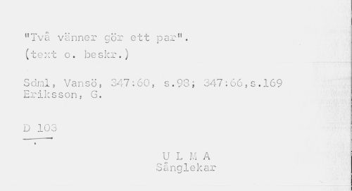 //// "Två vänner gör ett par", (text o. be skr.) //// Sami, Vansö , 347:60, $.98', 347 : 66, s. 169 Eriksson, G. //// D 103 i //// U L M A Sånglekar ////