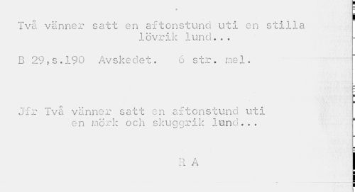 //// Två vänner satt en aftonstund uti en stilla //// lövrik lund.. . //// B 29?s.190 Avskedet. 6 str. mel. //// Jfr Två vänner satt en aftonstund uti //// en mörk och skuqqrik lund... //// R A J ////