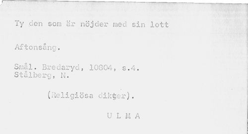 //// Ty den som är nöjder med sin lott Aftonsång. //// imj //// Smal. Bredaryd, 10804, s.4. Stålberg , N. //// (Religiösa dikter). //// U L M A ////