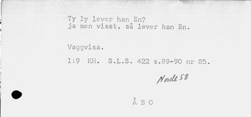 //// iy ly lever han än? //// ja men visst, så lever han än. //// Vaggvisa. //// 1:9 KH. S.L.S. 422 s.89-90 nr 85. //// A B O ////