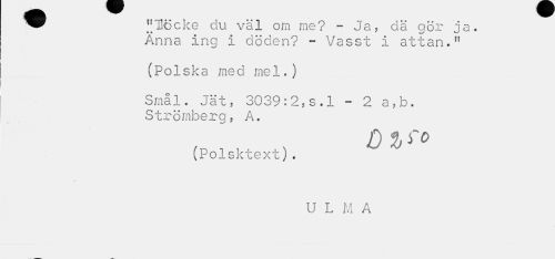 //// JJUöcke du väl om me? - Ja, dä gör ja. Anna ing i döden? - Vasst i attan.11 //// (Polska med mel.) //// Smål. Jät, 3039:2,s.l - 2 a,b. Strömberg, A. //// (Polsktext). //// U L M A ////