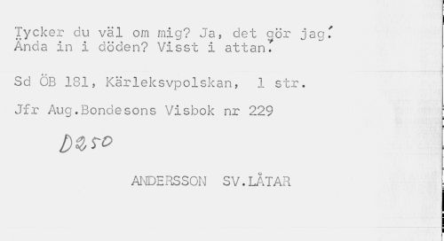 //// I //// I //// Tycker du väl om mig? Ja, det cjör jag T Ända in i döden? Visst i attan. //// Sd OB 181, Kärleksvpolskan, 1 str. Jfr Aug.Bonde sons Visbok nr 229 //// i //// ANDERSSON SV.LÅTAR . ////
