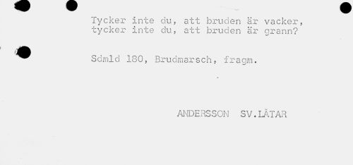 //// Tycker inte du, att bruden är vacker, tycker inte du, att brud //// g n q r grann? //// « Mm //// Sdmld 180, Brudmarsch, fragm. //// ANDERSSON SV.LÅTAR ////