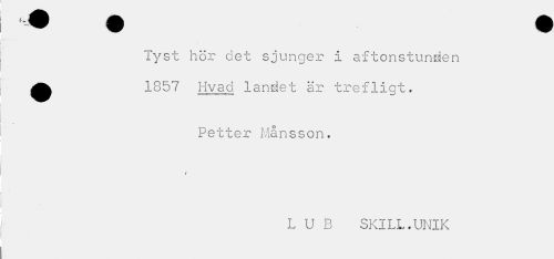 //// Tyst hör det sjunger I aftonstunden ^^ 1857 Hv a d landet är trefligt. //// Petter Månsson. //// i //// L U B SKILL.UNIK ////