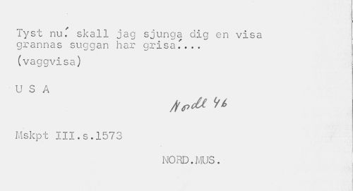 //// Tyst nu." skall jag sjunga dig en visa grannas suggan har grisaf... //// (vaggvisa) USA //// Mskpt III.s.1573 //// NORD.MUS. ////