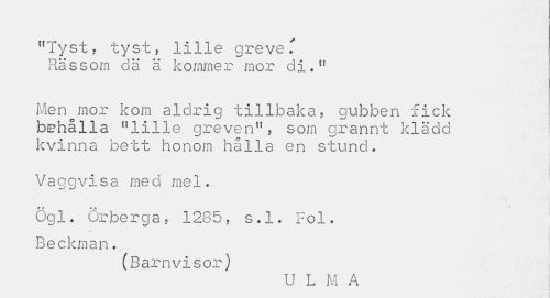 //// j //// "Tyst, tyst, lille greve T Rässom dä ä kommer mor di." //// Men mor kom aldrig tillbaka, gubben fick behålla nlille greven", som grannt klädd kvinna bett honom hålla en stund. //// Vaggvisa med mel. //// ögl. örberga, 1285, s.l. Fol. Beckman. //// (Barnvisor) //// U L M A ////