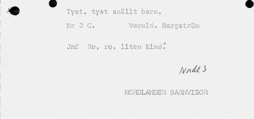 //// Tyst, tyst snällt barn, //// i //// Nr 3 C. Vermlo? Borgström. //// Jmf Ro, ro, liten kind T //// i v nit i //// NORDLANDER BARNVISOR ////