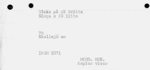 //// Tåcka på dä Britta Sänga e fö litta //// Vg //// Skallsjö sn IFGH 2371 //// NORD. MUS. Kopior visor ////