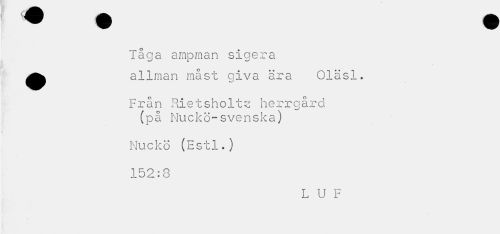 //// m ^ ^jjjj^ //// Tåga ampman sigera ^^ allman måst giva ära Oläsl. //// Från Rietsholte herrgård (på Nuckö-svenska) //// Mucko (Estl.) //// 152:0 //// L U F ////