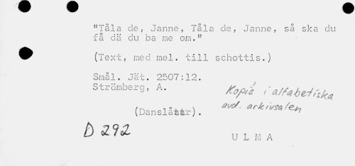 //// "Tåla de, Janne, i åla de, Janne, så ska du //// få dä du ba me om." //// ^^ (Text, med mel. till schottis.) //// Små1. Jät. 2507:12. //// Strömberg, A. ^ /'*//« //// (Danslåitr). ** b U L M A //// i ////