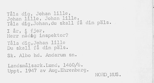 //// Tåla dig, Johan lille, //// Johan lille, Johan lille, //// Tåla dig,Johan,du skall få din päls. . //// I år, i fjor, //// Herr nådig inspektor? //// Tåla dig,Johan lille Du skall få din päls. //// Sk. Albo hd. Andarum sn. //// Landsmålsark.Lund, 1460/6. Uppt. 1947 av Aug.Ehrenberg. //// NORD MUS. ? ////