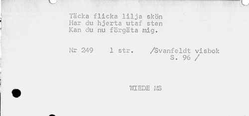 //// Täcka flicka lilja skön Har au hjerta utaf sten Kan du nu förgäta mig. //// Nr 249 1 str. /Svanfeldt visbok //// S. 96 / //// _ WIEDE MS ////