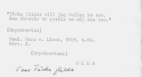//// I //// i //// "Täcka flicka vill jag fuller ha san, Som förstår te pyssla om mäj bra san." //// (Dryckesvisa) //// Vsml. Nora o. Linde, 9909, s.36. Bore, E. //// (Dryckesvisor) _ U L M A //// <T;/ ////