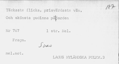 //// Täckaste flicka, prisvärdaste vän, Och skönsta gudinna påljorden //// Nr 767 1 str. Mel. //// Fragm. //// SIM^O //// mel.not. //// LAGUS NYLÄNDSKA F0LKV.3 ////