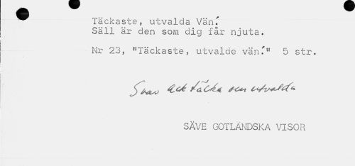 //// ^ Täckaste, utvalda Vän.' //// Säll är den som dig får njuta. //// Nr 23, "Täckaste, utvalde vän.'" 5 str. //// jfit^ /ciOléi ^vW^ //// SÄVE GOTLÄNDSKA VISOR ////