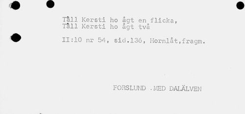 //// I ^ W 1 9 //// Tall Kersti ho ågt en flicka, Tall Kersti ho ågt två //// 11:10 nr 54, sid.136, Hornlåt,fraqm. //// % //// FORSLUND -MED DALÄLVEN ////