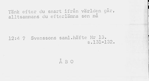 //// i //// Tänk efter du snart ifrån världen gar, alltsammans du efterlämna sen må //// 12:4 ? Svenssons saml.häfte Nr 13. 1 //// s.131-132. //// A B O //// ...1 //// i ////